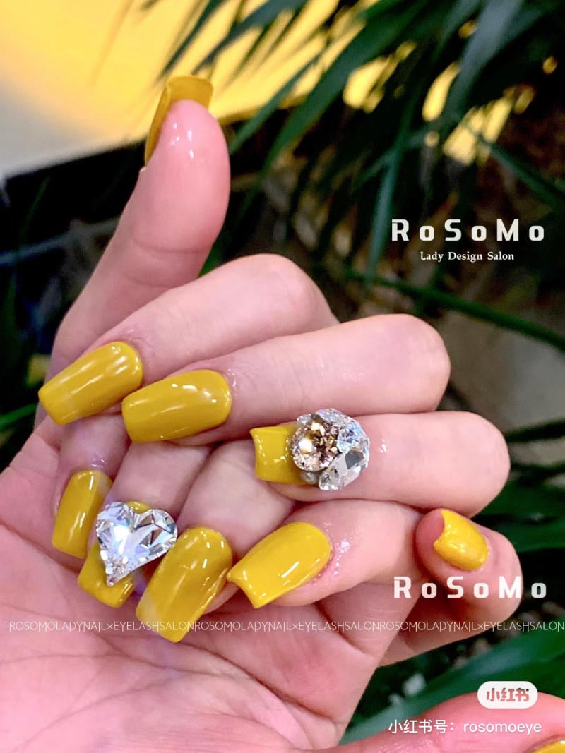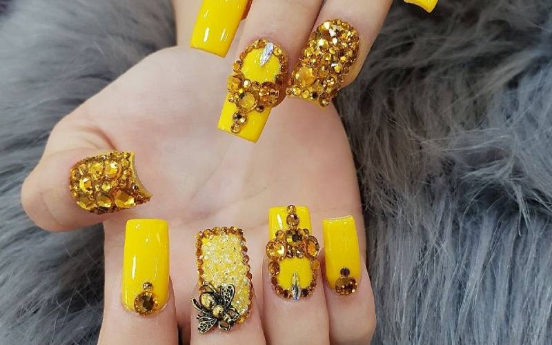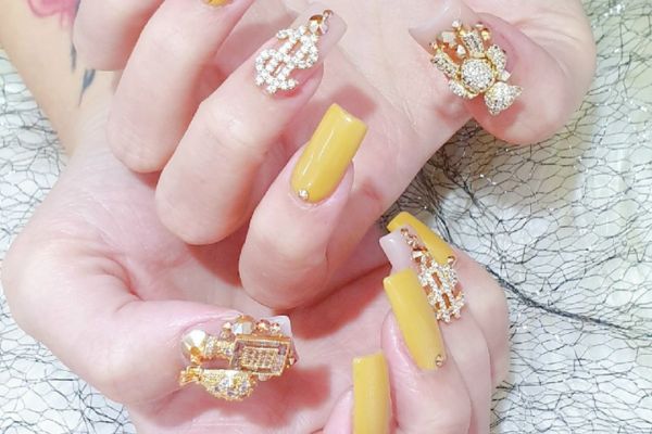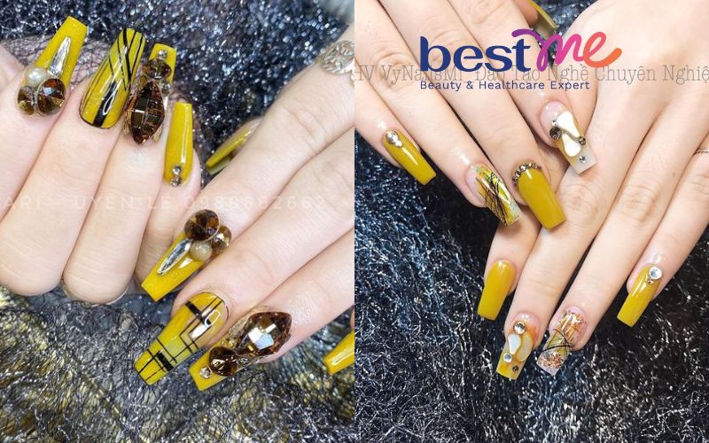 Nếu bạn có làn da trắng sáng, mẫu nail vàng nghệ chính là lựa chọn vàng để tôn lên vẻ đẹp của bạn. Sự kết hợp giữa màu vàng tươi sáng và những viên đá quý lấp lánh không chỉ khiến người khác phải trầm trồ mà còn thể hiện cá tính mạnh mẽ của bạn. Những chi tiết đính đá khéo léo trên móng sẽ tạo nên một tác phẩm nghệ thuật vừa ấn tượng vừa thu hút ánh nhìn.