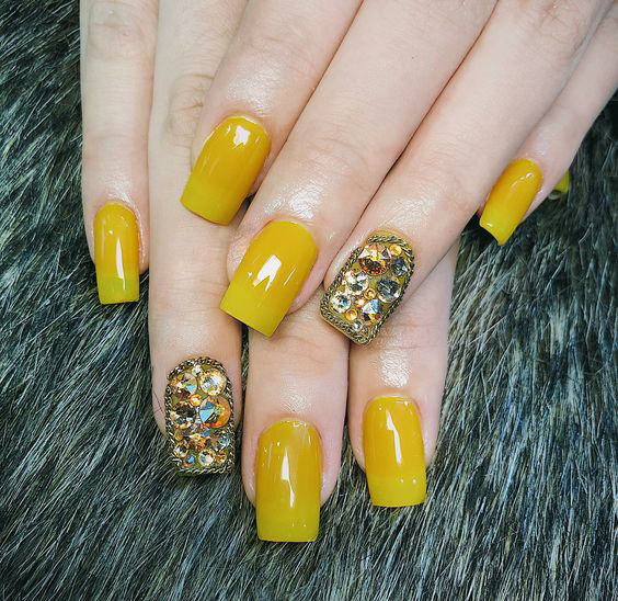 Nếu bạn là một tín đồ yêu thích màu vàng, mẫu nail màu vàng đính đá chắc chắn là gợi ý tuyệt vời cho bạn. Những bộ móng được thiết kế với hình dáng hạnh nhân hay vuông, tạo nên vẻ đẹp sang trọng và quyến rũ. Sự kết hợp giữa màu vàng nổi bật cùng những viên đá ánh trắng, xanh hay ngọc trai mang lại cảm giác rực rỡ và đầy cuốn hút.