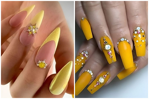 Móng tay vàng chanh điểm xuyết đá lấp lánh rạng rỡ