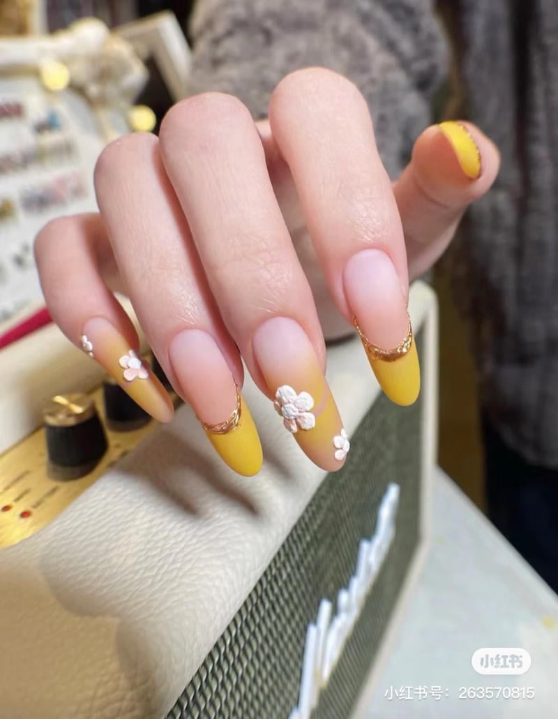 Để mẫu nail không bị đơn điệu, bạn có thể xen kẽ giữa các ngón trơn màu vàng với họa tiết nhẹ nhàng như hoa nhí, caro hay kim tuyến. Những nét chấm phá này không chỉ giúp bộ nails trở nên thu hút mà còn thể hiện phong cách riêng của bạn.