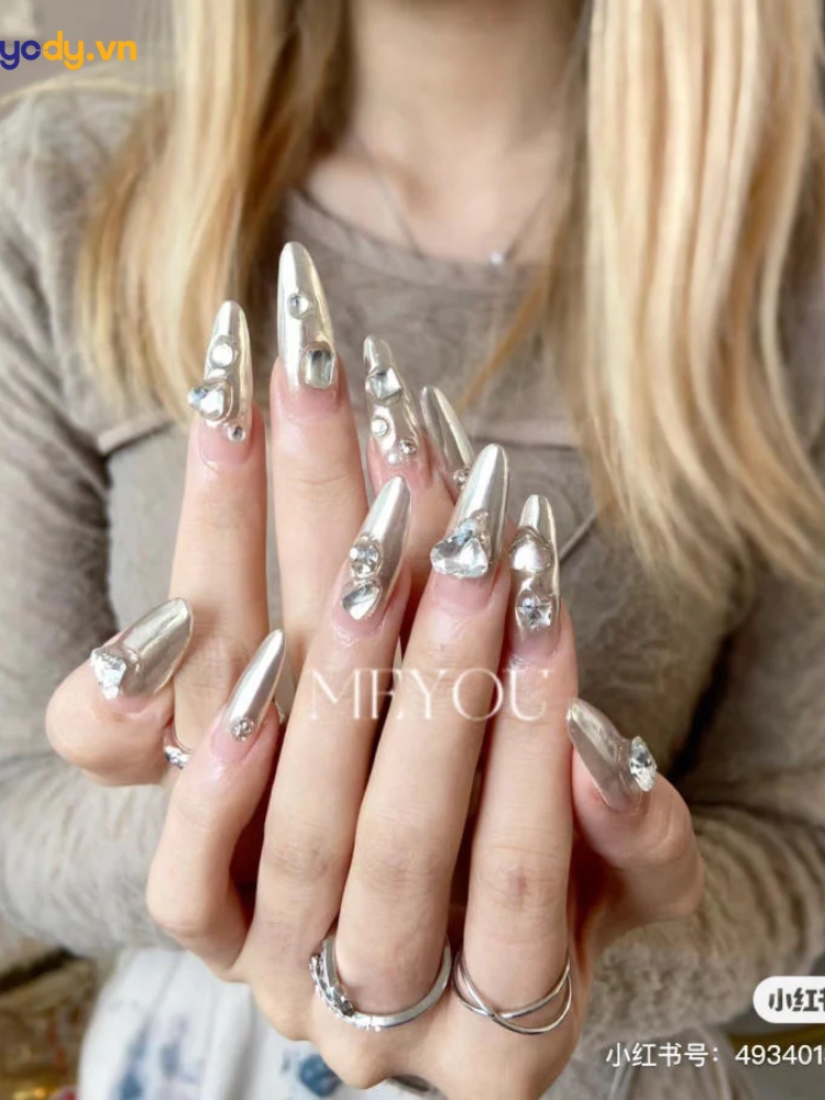 Nail tráng gương đính đá đang lên ngôi trong thế giới làm đẹp, mang đến một giao diện vừa nổi bật vừa sang trọng. Với hiệu ứng lấp lánh, kỹ thuật này sử dụng bột ánh kim loại đặc biệt, giúp móng tay trở nên bóng bẩy đến mức phản chiếu ánh sáng như gương. Mẫu nail này không chỉ đơn giản mà còn rất sang trọng, khiến bàn tay của bạn trở thành tâm điểm chú ý.
