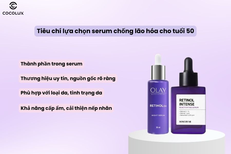Khi bước vào tuổi 50, làn da bắt đầu lão hóa với sự xuất hiện của nếp nhăn và mất đi độ đàn hồi. Để cải thiện tình trạng này, serum chống lão hóa là một lựa chọn tuyệt vời. Nổi bật trong số đó là Retinol, một dẫn xuất của vitamin A, giúp thúc đẩy sản sinh collagen, làm mềm mịn da và giảm thiểu nếp nhăn.
