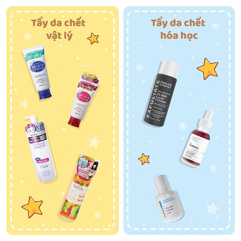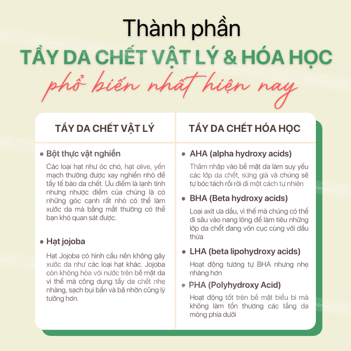 Khi lựa chọn giữa tẩy da chết vật lý và tẩy da chết hóa học, có nhiều điều cần xem xét. Tẩy da chết hóa học thường nhẹ nhàng hơn, phù hợp cho những làn da nhạy cảm. Thay vì dùng lực ma sát như tẩy da chết vật lý, phương pháp này sử dụng các hợp chất hóa học như AHA và BHA để loại bỏ tế bào chết một cách hiệu quả hơn.