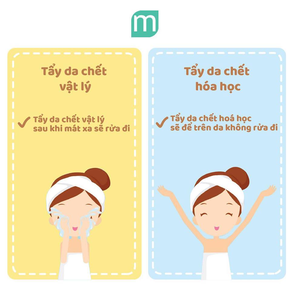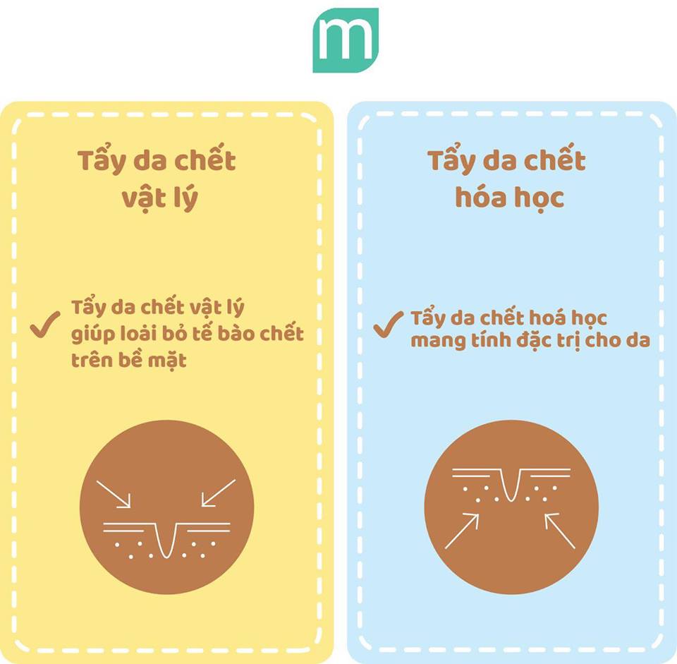Tẩy da chết vật lý sử dụng hạt scrub hoặc các dụng cụ kỳ để tác động lên bề mặt da, giúp làm sạch và làm mịn. Tuy nhiên, việc này chỉ nên thực hiện từ 1 đến 2 lần mỗi tuần để tránh gây tổn thương cho da. Ngược lại, tẩy da chết hóa học có thể được áp dụng thường xuyên hơn và đến từ nhiều thành phần khác nhau, mang lại lợi ích toàn diện hơn cho làn da.
