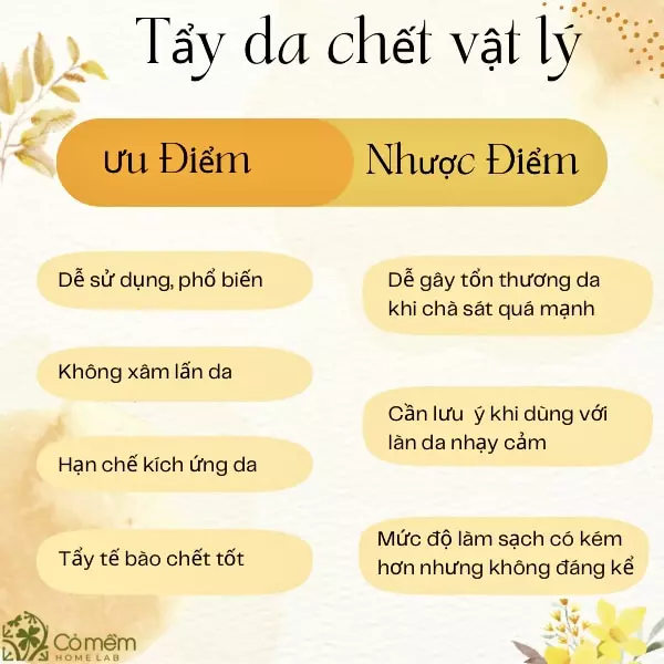 Tẩy da chết là một bước quan trọng trong chu trình chăm sóc da giúp lấy đi lớp tế bào già cỗi, kích thích tái tạo da và giữ cho làn da luôn tươi sáng, mịn màng. Trong số các phương pháp tẩy da chết hiện nay, tẩy da chết vật lý được nhiều người lựa chọn nhờ hiệu quả và tính tiện lợi. Tuy nhiên, phương pháp này cũng có những ưu và nhược điểm riêng, đòi hỏi người dùng cần hiểu rõ để sử dụng đúng cách và an toàn cho làn da. Hãy cùng khám phá chi tiết về tẩy da chết vật lý trong bài viết dưới đây.