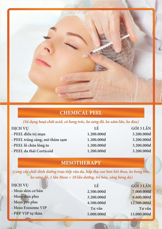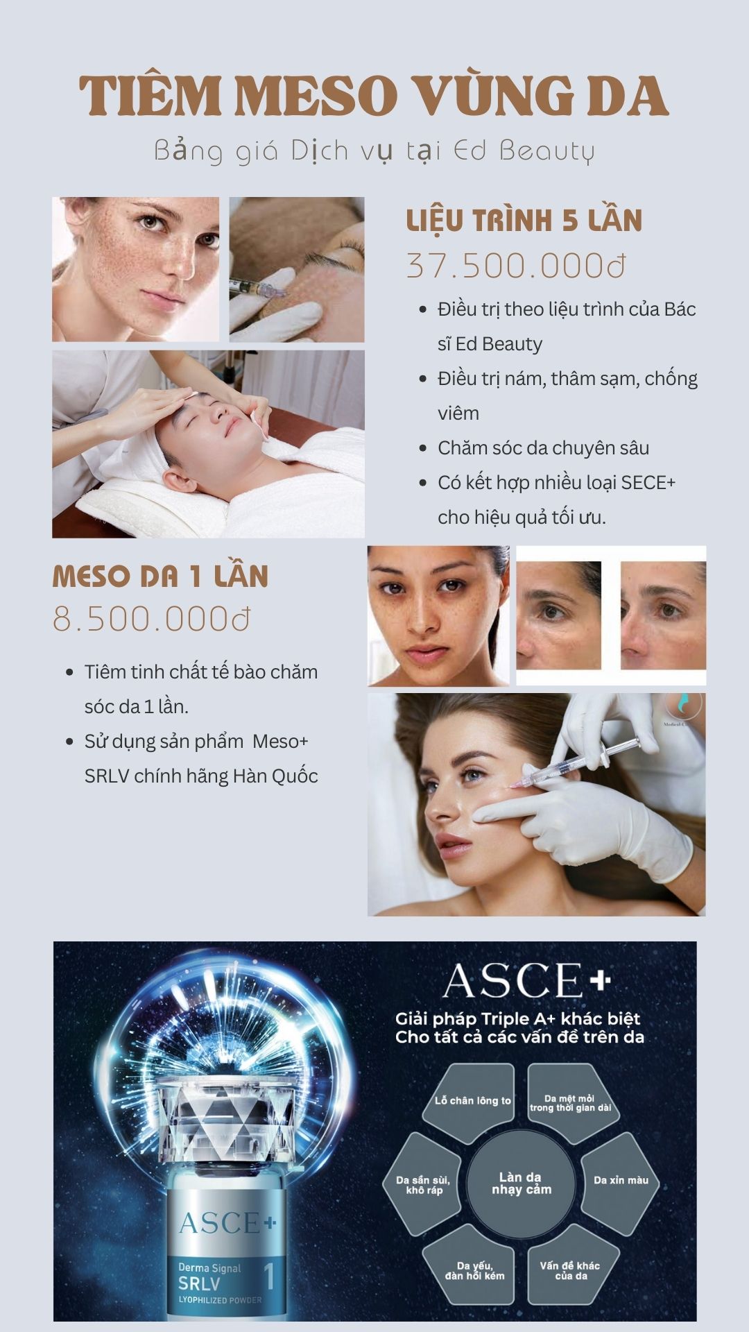 Tiêm meso là một phương pháp làm đẹp không xâm lấn ngày càng được ưa chuộng, đặc biệt trong điều trị các vấn đề về da như nám, sạm màu hay lão hóa. Về giá cả, liệu pháp này thường khởi điểm từ khoảng 2.200.000 đồng mỗi lần. Tuy nhiên, mức chi phí cụ thể sẽ phụ thuộc vào nhiều yếu tố như tình trạng da và diện tích điều trị.