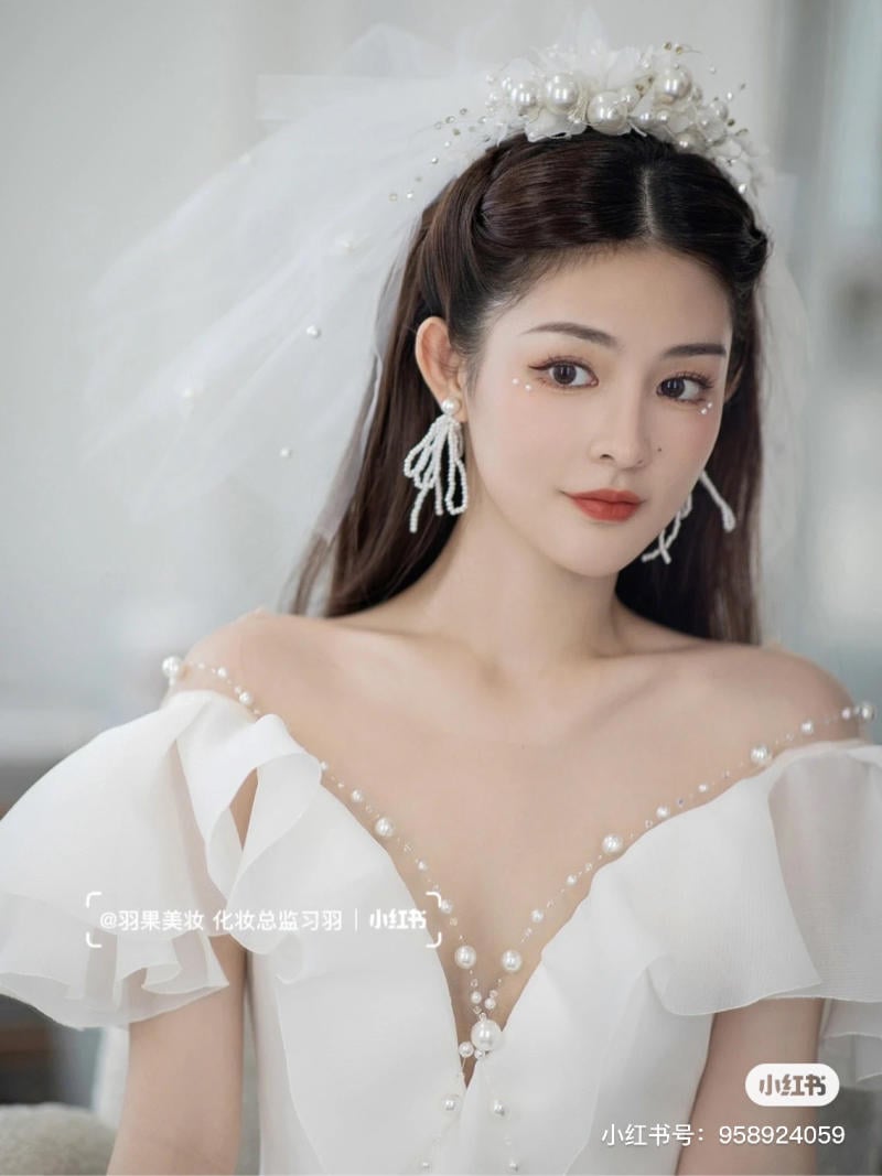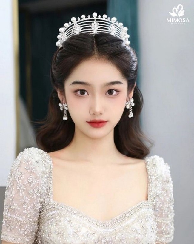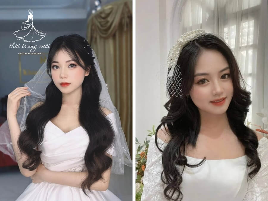 Tóc buộc nửa đầu không chỉ giúp tôn lên vẻ đẹp của gương mặt mà còn tạo độ bồng bềnh cho tóc xõa. Nếu bạn muốn thêm phần trẻ trung, có thể chọn cách uốn xoăn lơi hoặc buông xõa thẳng tự nhiên. Đây là những kiểu tóc đơn giản nhưng lại cực kỳ thu hút, làm nổi bật vẻ đẹp nhẹ nhàng của cô dâu trong ngày trọng đại.