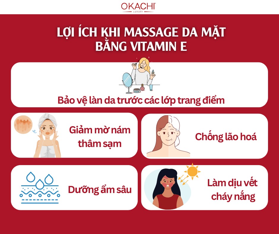 Vitamin E giúp cấp ẩm đầy đủ cho da, ngăn ngừa tình trạng khô ráp và làm mờ các vết thâm, nám. Bên cạnh đó, nó còn có tác dụng bảo vệ làn da dưới tác động của tia UV, giúp giảm thiểu những thiệt hại do ánh nắng mặt trời. Nhờ vào đặc tính chống oxy hóa mạnh mẽ, vitamin E còn hỗ trợ làm chậm quá trình lão hóa, giữ cho làn da luôn trẻ trung và khỏe mạnh.